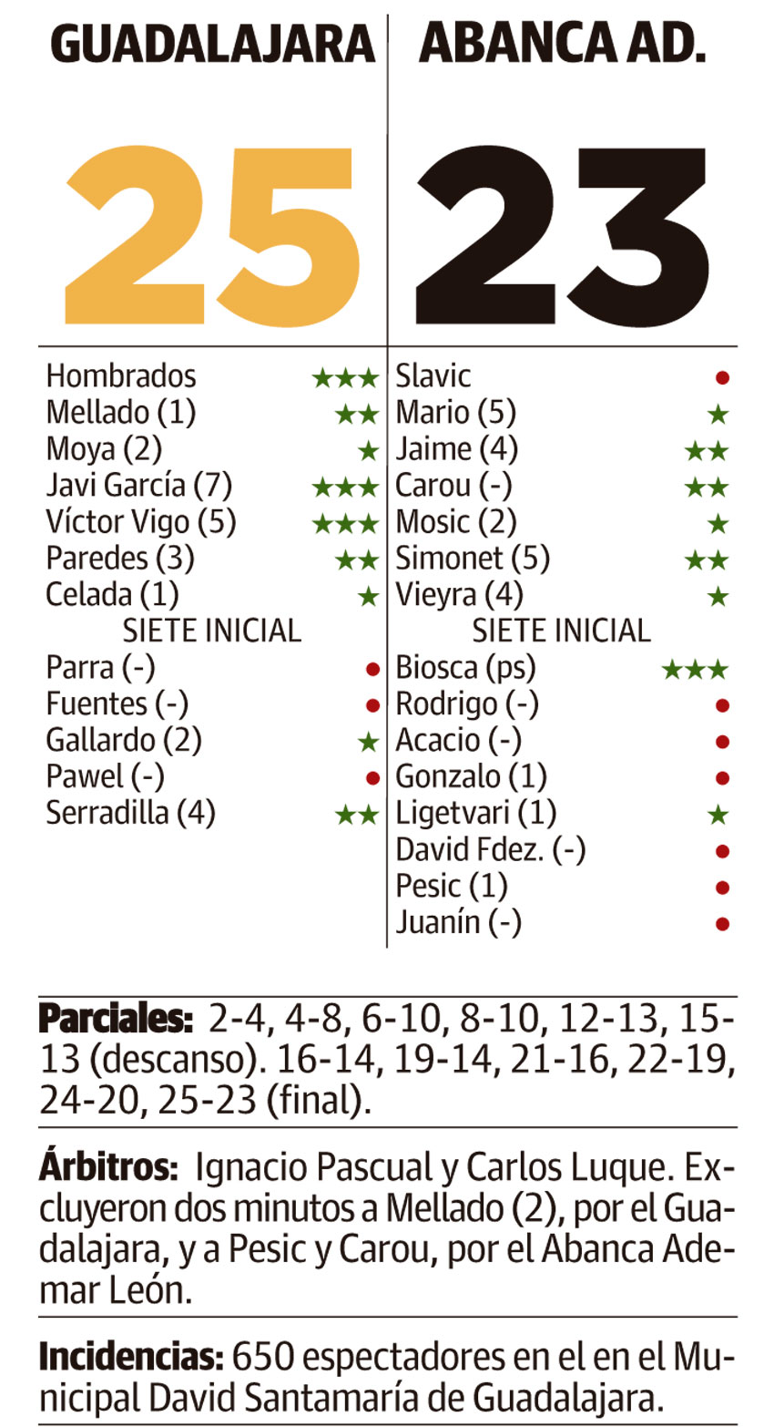 Mellado en el avanzado y Javi García y Víctor Vigo en ataque lideraron al Guadalajara, si bien la mixta de Jaime sobre el central desactivó su ataque Ya llovía menos. El partido estaba abierto. La dinámica era favorable a los leoneses. La sensación era que podía lograrse la remontada. Pero volvió a aparecer Hombrados. Tuvo ataque el Ademar para ponerse a uno, pero detuvo el tiro de Vieyra. Siguió el 23-20 fijado durante varios minutos, pero Pesic se topaba con el madrileño y Mosic lanzaba directamente fuera.