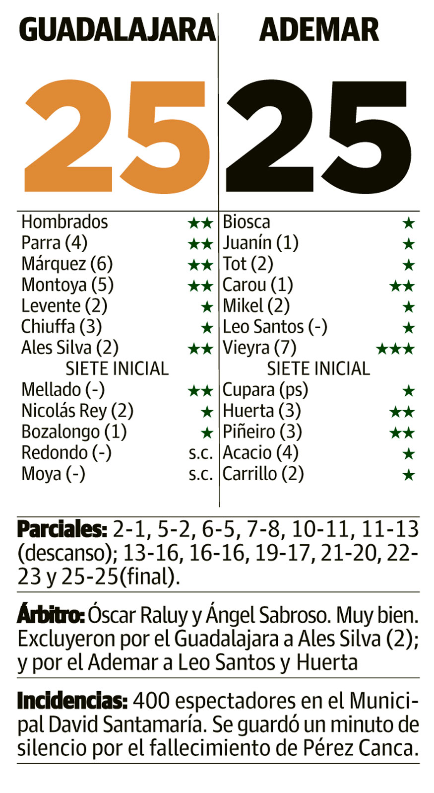 25-25 es el resultado final. Al Abanca Ademar se le escapa un punto. El primero de la temporada. Acaban siendo demasiado rémora esos malos arranques, que son los que le condenan. Porque, si ante Huesca comenzó las dos mitades en tromba, ésta todo lo contrario. En la primera, a los nueve minutos con 5-2 en el marcador, Guijosa tenía que pedir tiempo muerto, en el que echaba una considerable bronca a su equipo entre voces y aspavientos.