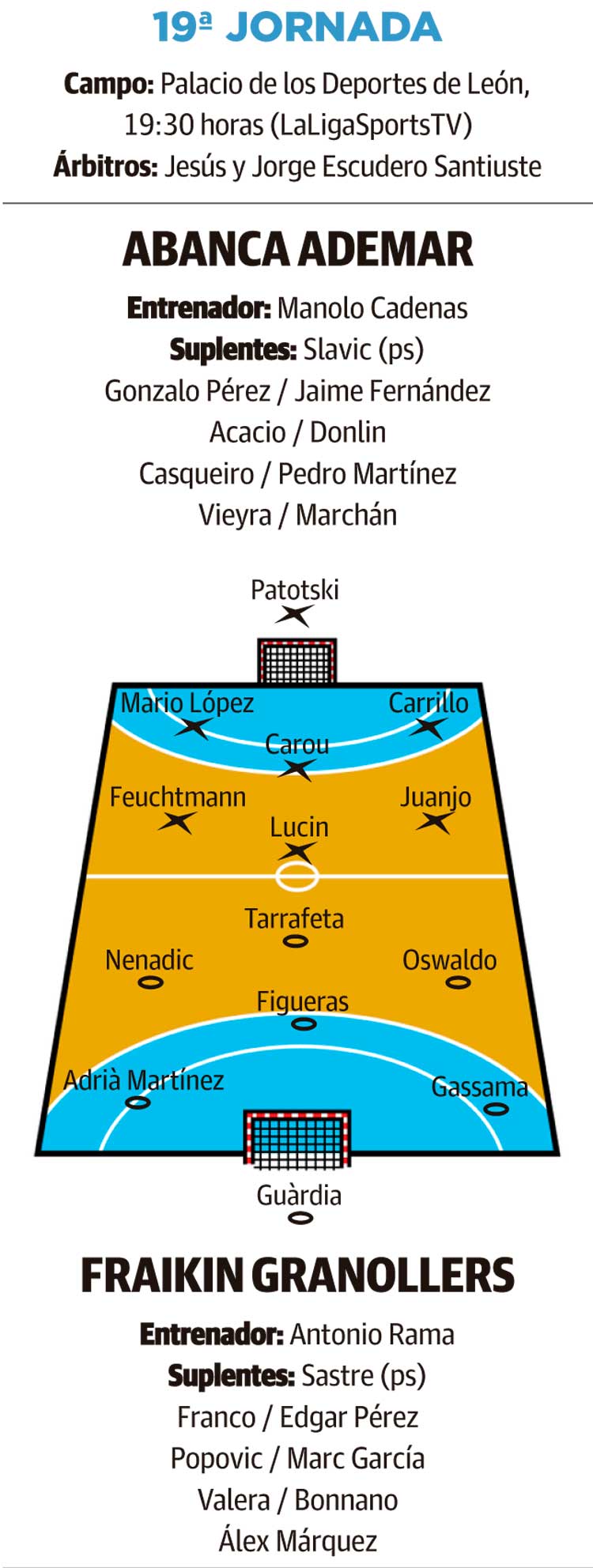 El Abanca Ademar aún no ha ganado en casa desde el parón de enero, algo que tratará de solventar hoyUn Granollers con argumentos para ganarle a cualquiera y que de hecho es el único equipo además del F.C. Barcelona que cuenta en sus filas con un campeón de Europa. Adrià Figueras es la gran estrella del conjunto catalán, siendo de hecho el máximo goleador de la liga y acaparando buena parte del juego ofensivo de los de Antonio Rama. Además, está bien refrendada su aportación por la primera línea con jóvenes como Tarrafeta, Álex Márquez o Valera y otros nombres ya consolidados como Nenadic o Oswaldo liderando el ataque. En defensa, Marc García, Bonnano o el propio Figueras complican el ataque por el centro si bien es cierto que el adiós de Almeida ha debilitado una portería en la que se reparten los minutos Guàrdia y Sastre.