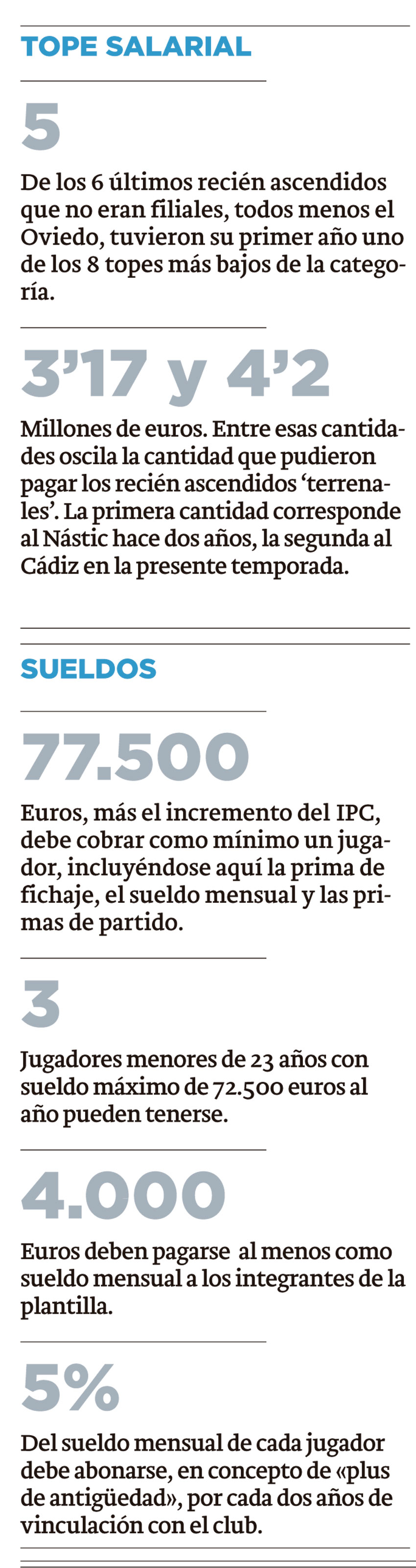 Segunda A es un salto deportivo muy importante, pero sobre todo descomunal en términos organizativos y económicos. Muchos cambios tendrá la Cultural en su nueva vida en la categoría de Plata del fútbol español, que incrementarán notablemente un presupuesto que puede pasar de dos millones a rondar los ocho.Mucho de ello se irá en salarios, cuyas características se regulan por el convenio del fútbol profesional publicado en diciembre de 2015 en el Boletín Oficial del Estado (BOE), y que refleja que los futbolistas deben tener garantizadas «unas retribuciones mínimas por temporada» de 77.500 euros más el IPC, en los cuales se incluye la prima de fichaje, el sueldo mensual (que no puede ser inferior a 4.000 euros) y las primas de partidos. Eso sí, puede haber un máximo de tres jugadores, menores de 23 años, que se queden en 72.500.Los futbolistas tendrán dos pagas extraordinarias y existe un plus de antigüedad por el cual, por cada dos años de vinculación de un integrante con el mismo club, tendrá que recibir una prima de un 5% de su sueldo mensual.La Liga fija un tope salarial a cada club en función de ingresos, gastos y deuda; podría rondar los 4 millones Grandes cantidades que contribuye a pagar sobre todo la importante cantidad que se recibe en cuestión de derechos televisivos. Y es que el 70% del dinero de esa materia que reciben los clubes de Segunda A se reparte de forma lineal, lo cual supone que la Cultural vaya a cobrar un mínimo de 4 millones y medio de euros por ese concepto.El otro 30%, que supone casi 43 millones de euros, se divide en función de doscriterios, que reparten cada uno la mitad de esa cantidad y que vienen regulados en el Real Decreto-ley 5/2015.Así pues, más de 21 millones se reparten en función de la clasificación de la última temporada, yendo el reparto desde el 17% que se lleva el primer clasificado hasta el 0’25% del último.
