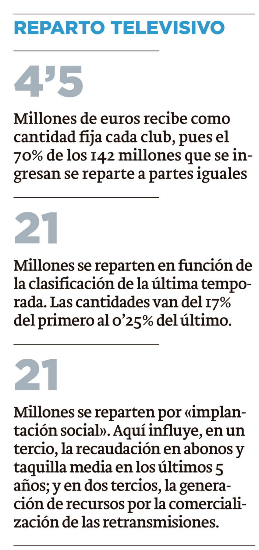 ¿Los otros 21 millones? Van por lo que se denomina como implantación social, criterio determinado en dos tercios por «la participación en la generación de recursos por la comercialización de las retransmisiones televisivas» y en un tercio por «la recaudación en abonos y taquilla media de las últimas cinco temporadas».