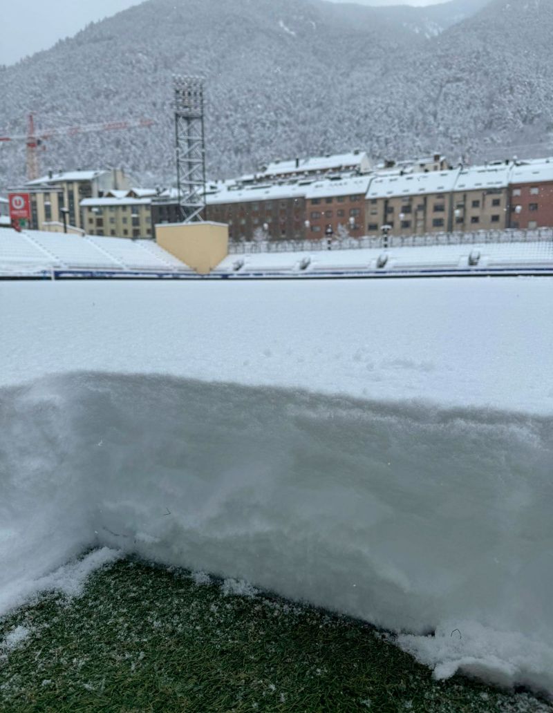 Lo que a principio de semana se antojaba un temor fundado y a finales al mejorar las previsiones algo más improbable, acabó siendo una posibilidad muy real este sábado por la mañana cuando la localidad andorrana amaneció con una enorme nevada que tiñó de blanco la ciudad y dejó más de 25 centímetros de nieve en el campo de juego, dejándolo impracticable y con poco margen de solución más aún cuando seguía nevando.