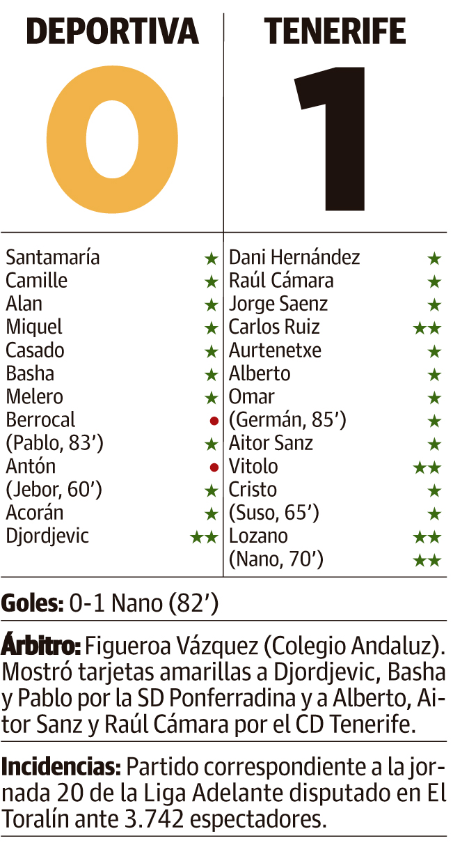 La Deportiva también se ahoga en El Toralín. El Tenerife salió con los tres puntos del que fuera un fortín, un salvavidas al que el conjunto berciano se agarraba para salir a flote cuando las cosas no salían fuera de casa, en un partido marcado por la lluvia y el mal estado del césped. Lo hizo gracias a un gol en la recta final del partido de Nano, el único que se atrevió a probar fortuna con un disparo desde fuera del área que sorprendió a Santamaría, tan fuera de sitio como el resto de sus compañeros.El Tenerife supo leer un partido que a la Ponferradina se le atascó desde la tapa. Renunció a cualquier combinación a ras de suelo y buscó en jugadas de estrategia y balones aéreos un premio que encontró a diez minutos del final, confirmando el mal momento de los bercianos, que han sumado un punto de los últimos doce posibles y han pasado de dormir en la cuarta plaza a vagar por la zona media de la tabla (12º) justo antes de afrontar dos salidas complicadas -Girona y Elche- que pueden meter a los de Manolo Díaz en un lío.