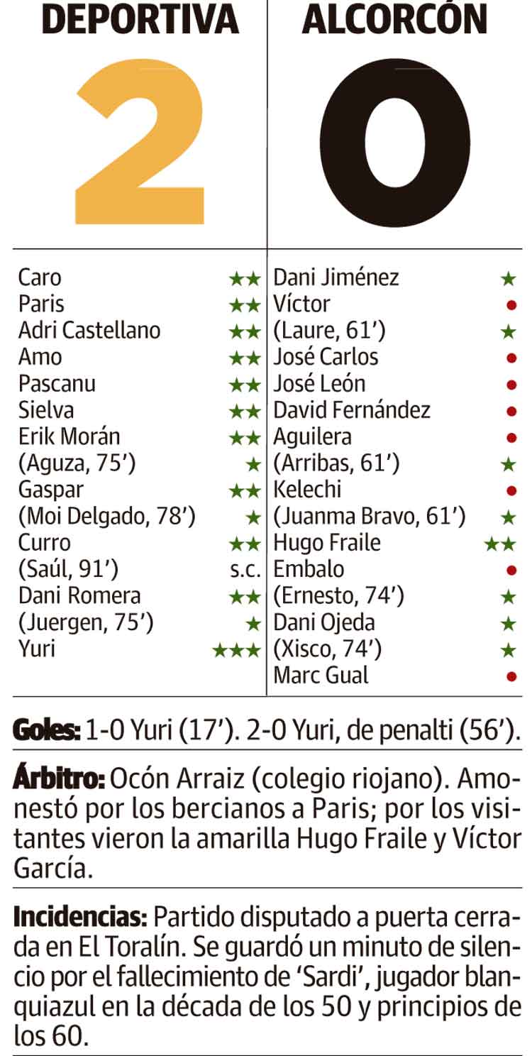 Que Ponferradina y Alcorcón son las caras opuestas de una misma moneda lo dice la clasificación de la Segunda División, pero también las caras, los gestos y las acciones individuales que componen un partido que este lunes enfrentaba a ambos y que se saldó con el resultado que todo ello invitaba a imaginar.Porque regresó la Deportiva a la senda del triunfo en su ‘nuevo’ Toralín, donde quedó deslumbrado un Alcorcón inocente, frágil y desacertado que puso en bandeja los tres puntos a una Ponferradina a la que le sirvió con mostrarse una vez más muy seria durante los 90 minutos y aprovechar dos errores visitantes para, en las botas de Yuri, sumar de nuevo de tres con mucha superioridad y sin ningún apuro a pesar de que las muchas bajas de los bercianos podrían haber supuesto un hándicap.