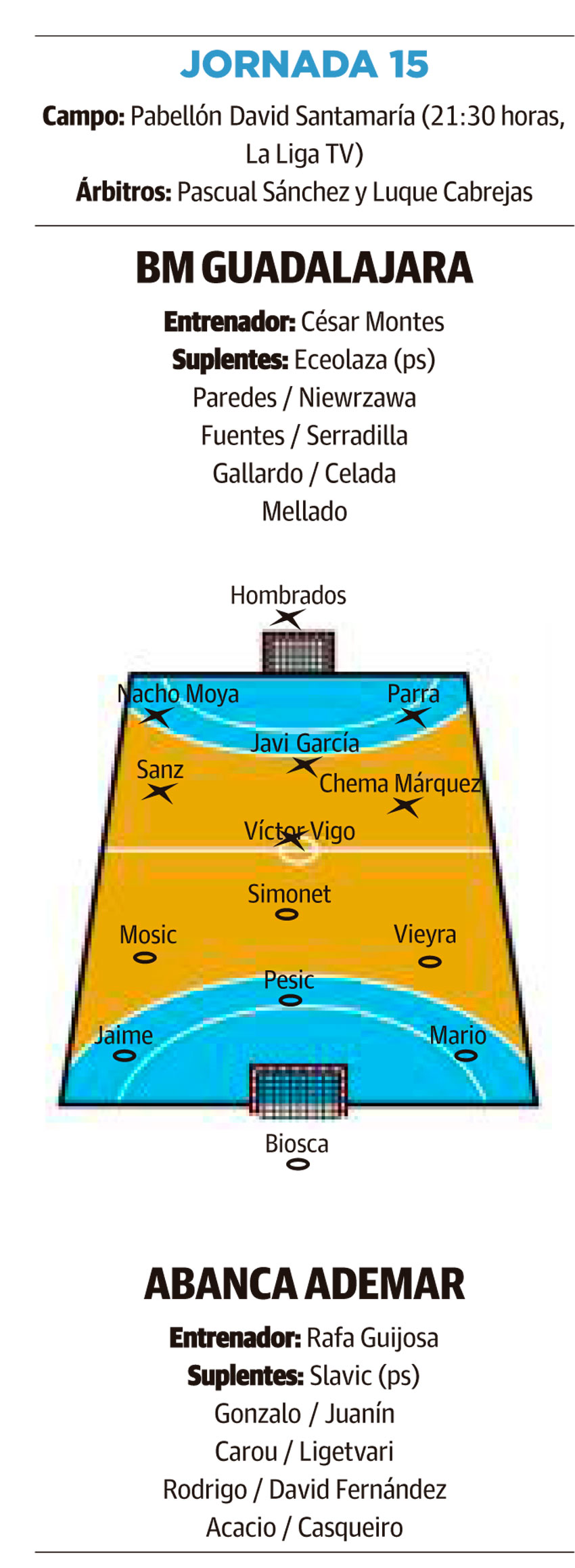 No se lo pondrá fácil un Guadalajara que acaba pagando a nivel físico su escasa rotación, pero que tiene un extraordinario siete inicial que le hace ser capaz de plantar cara a cualquier equipo. Ya el año pasado se dejó un punto en su pista el FC Barcelona y mismamente hace una semana ganaron a La Rioja (28-27), si bien este año además de tomarse la revancha el conjunto catalán (28-42) también consiguieron llevarse los dos puntos el Bidasoa (30-31) y el Huesca (24-28), además de empatar el Cuenca (28-29).