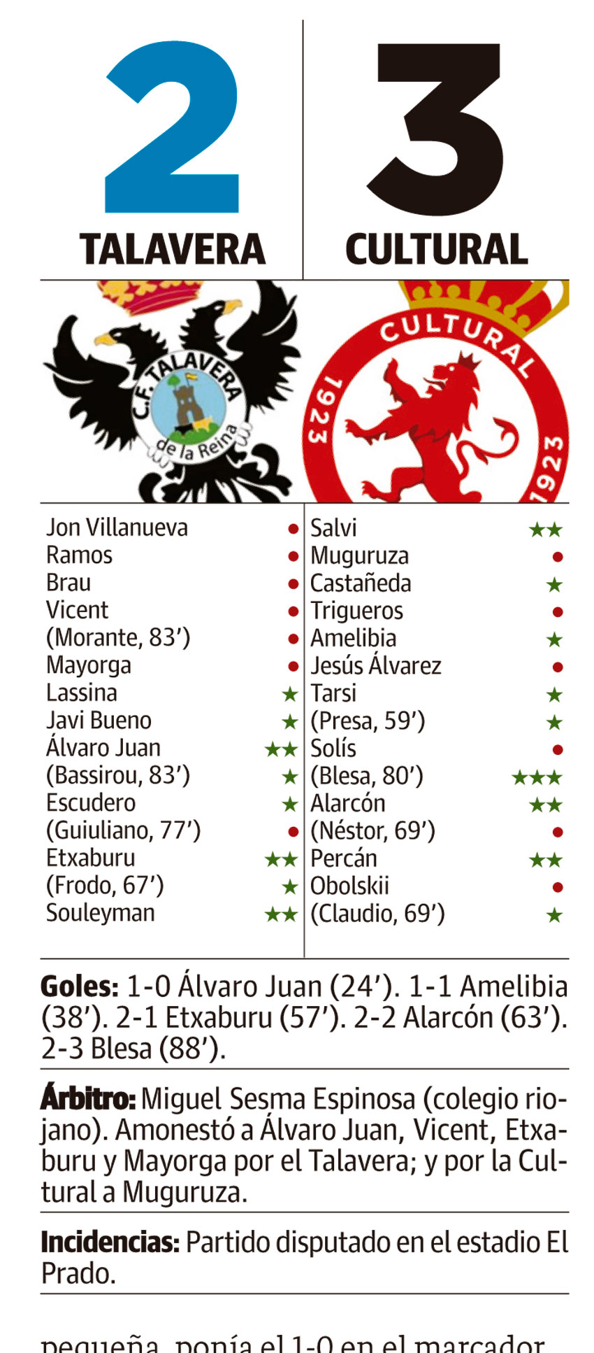 Perdonaba el Talavera y se lo hacía pagar la Cultural con la reivindicación de Blesa. El mediapunta brilló cuando salió en la segunda parte ante el Badajoz, fue de los mejores en su única titularidad ante el Ceuta y luego desapareció para Docampo, saliendo a menos de un cuarto de hora para el final contra el Ferrol y también este domingo. Pero esta vez, los 10 minutos más descuento que le dio fueron suficientes. Casi en el primer balón que tocó, dio un pase a la espalda de la defensa de esos que nadie en el actual centro del campo culturalista ve ni intenta, pero Querol centró mal. Y la vez en la que controló dentro del área acabó sacándose un disparo seco, potente y raso al primer palo, superando a Villanueva y dando a la Cultural el triunfo (2-3).