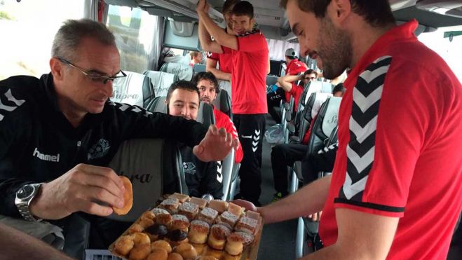 Huerta llevó al bus que llevaba al Ademar a Granollers pasteles por su cumpleaños. | JAVIER QUINTANA