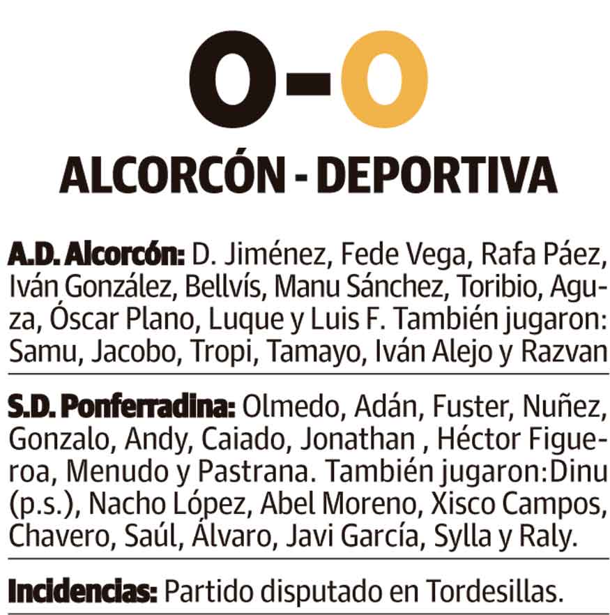 La Deportiva mostró buenas sensaciones en el partido que ayer le enfrentó a un rival de superior categoría como es el caso del Alcorcón en un partido en el que ambos tuvieron ocasiones que nadie pudo materializar.Tras unos minutos iniciales de tanteo entre ambos equipos, fue la Deportiva la primera que creó peligro con una falta directa que se marchó a centímetros de la portería de Jiménez. De hecho, fue el balón parado el que generó más ocasiones en la primera mitad, y es que poco después un viejo conocido de la afición blanquiazul como Sergio Aguza a punto estuvo de sorprender a Olmedo, que fue en esta ocasión titular, aunque su disparo desde el borde del área rozó el larguero, travesaño en el que también impactó un remate de cabeza de Núñez.