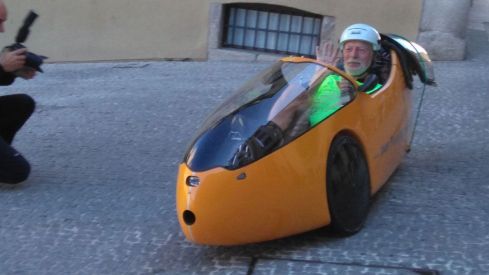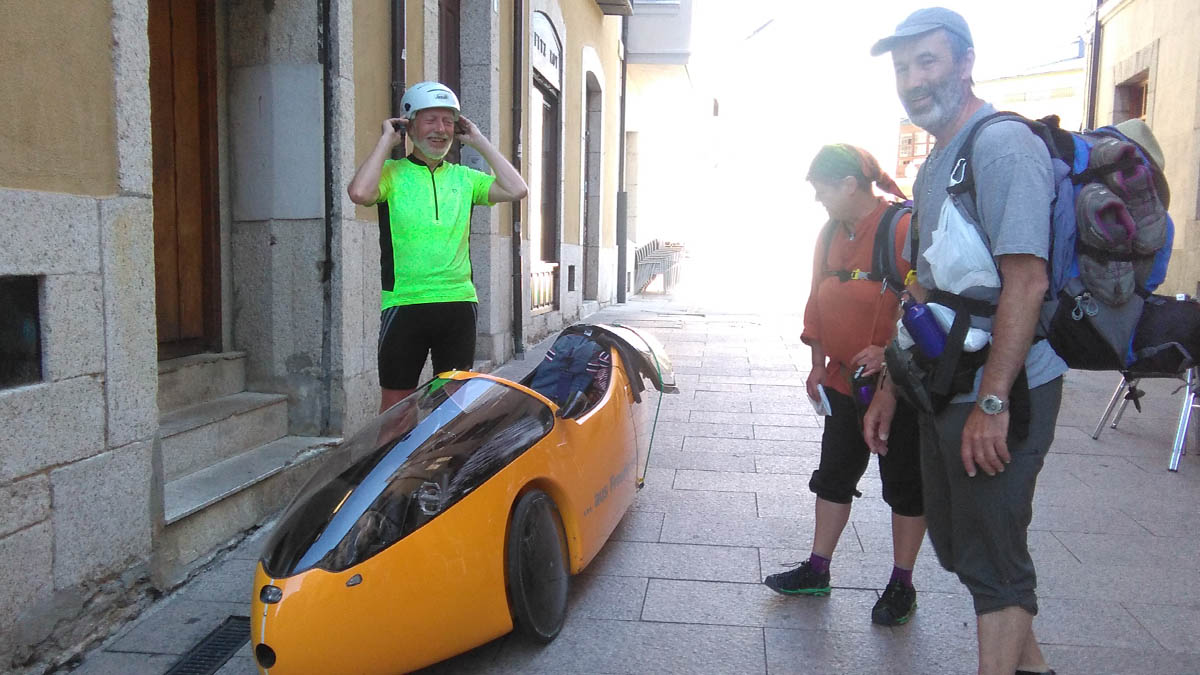 El velomóvil es un vehículo de tracción humana, con el mecanismo de una bicicleta pero con tres ruedas y habitáculo cerrado, muy aerodinámico y que le permite recorrer hasta 200 kilómetros al día en los días favorables, según explicó su piloto. Viaja por carreteras convencionales con gran comodidad, y en tramos llanos, como el que une Burgos y León ha llegado a alcanzar “los 45 kilómetros por hora”.