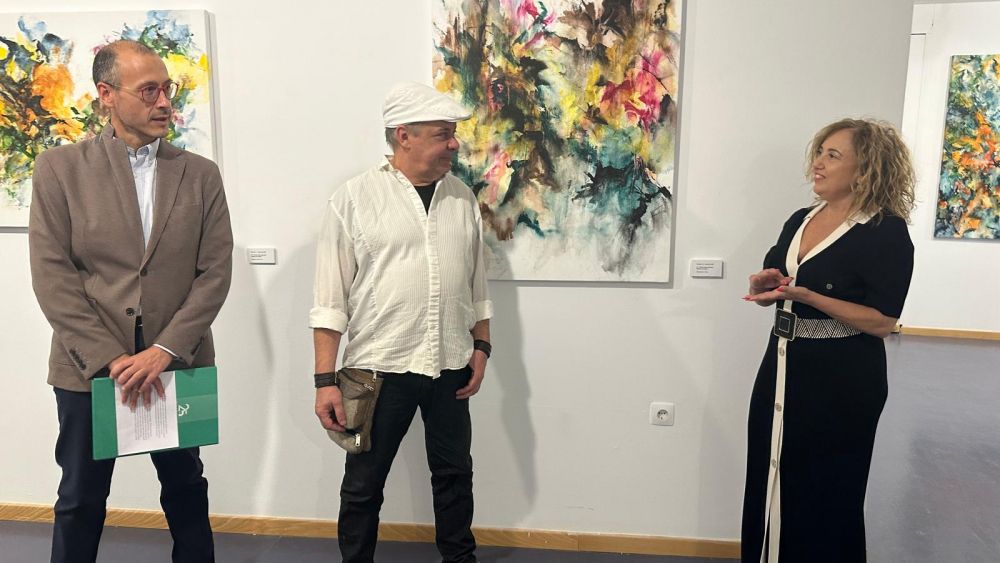 La vicerrectora, Pilar Marqués y el director del Área de Cultura de la ULE, Iván Rega, han acompañado al autor en la inauguración este jueves de una exposición que busca la luz y la fuerza del color en la transparencia nutriéndose del comportamiento natural de los materiales pictóricos.