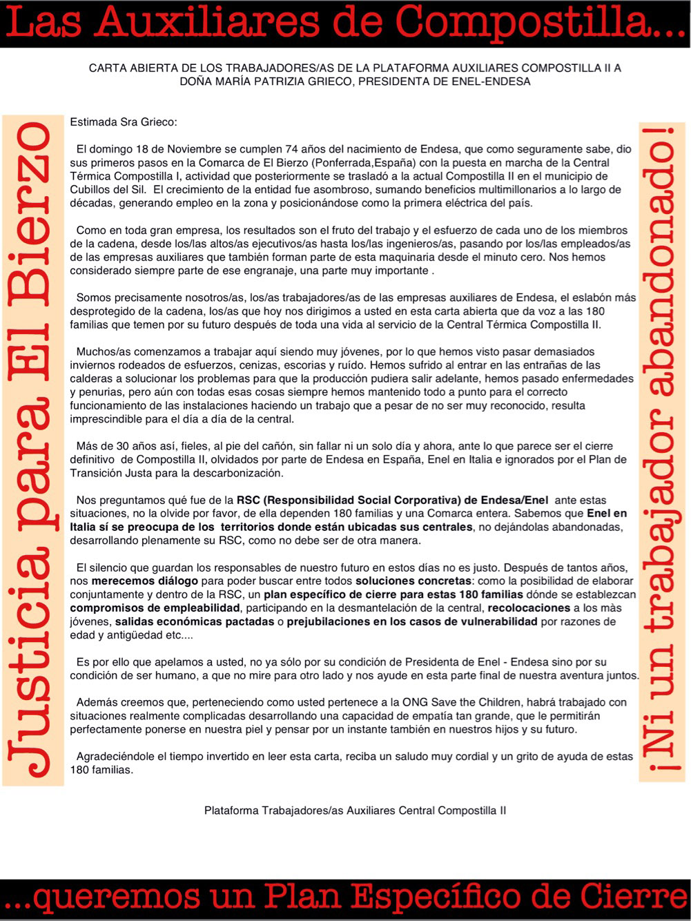 En su carta, apelan a la Responsabilidad Social Corporativa del grupo, que esa una de las señas de indentidad de Endesa, y a la propia Grieco, "no sólo a su condición de presidenta, sino de ser humano" ante lo que se plantea como un final para la térmica de Compostilla. Y es que, aseguran que los trabajadores auxiliares, después de "30 años fieles al pie del cañón, sin fallar un sólo día" a su tarea, se encuentran ahora "olvidados por parte de Endesa en España, Enel en Italia e ignorados en el Plan de Transición Justa para la descarbonización" que plantea el Gobierno de Pedro Sánchez atendiendo a las directrices de Europa.