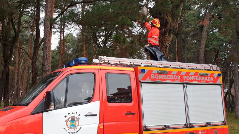 Los Bomberos de Ponferrada han erradicado en los últimos días un total de 25 nidos de procesionaria en pinos del parque del Temple dentro de una importante ofensiva contra esta plaga que está realizando el Ayuntamiento.