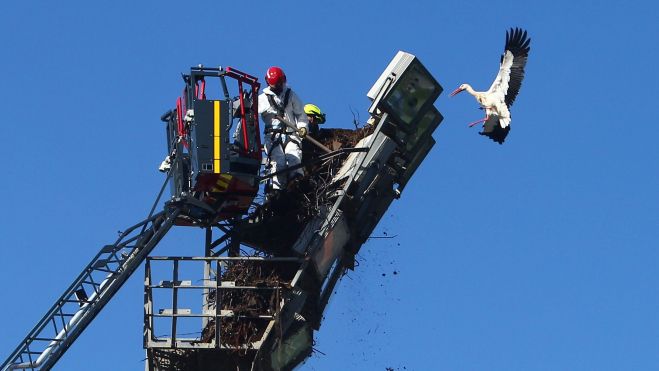 Se trata de un hecho que no deja de ser habitual pero que, en esta ocasión y como muestran las imágenes, ha tenido el acompañamiento de la propia cigüeña. El ave ha sido testigo de cómo los Bomberos de Ponferrada retiraban su 'casa' mientras planeaba a su alrededor. Después, junto a otra cigüeña, han tenido que apostarse en otra de las torretas, quien sabe si con la intención de volver a armar allí su nido. Estamos en febrero y ya lo dice el refrán, "por San Blas...".