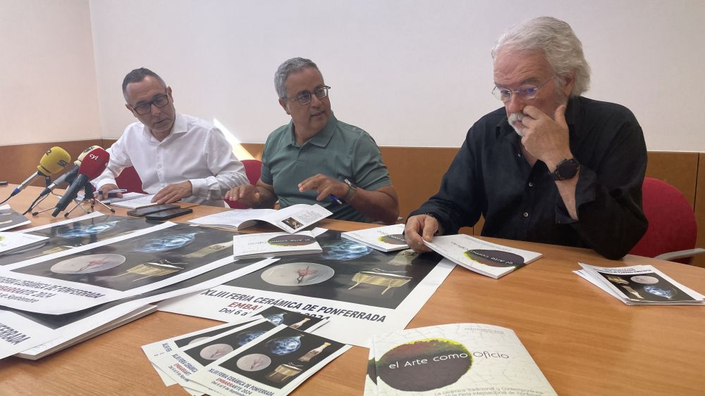 El concejal Carlos Cortina, el académico Alfonso Fernández-Manso y el ceramista Gerardo Queipo presentaron este miércoles los entresijos del programa preparado. En total, 18 ceramistas y 9 alfareros se sumarán a un evento que tiene representación internacional (los portugueses Jose Matos, Armando Moita, Carlos Mota, Guiomar Ferreira y Tato Sheriff) y también sello berciano. Precisamente, esto último se ha querido destacar en el cartel, el cual recoge cuatro obras de otros tantos artistas nacidos en el Bierzo o que han tenido pasado en la comarca para reflejar el impacto territorial de la feria en la comarca.