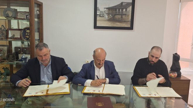 José Antonio Quiroga, presidente de la Confederación; Eduardo Morán, alcalde del Ayuntamiento de Camponaraya; y Jonathan López, pedáneo de la Junta Vecinal de Magaz de Abajo, ya han rubricado el convenio de colaboración que posibilitará la construcción de la nueva obra de paso sobre el Arroyo de Magaz o del Tablón, que conectará el camino entre Narayola y Cacabelos.