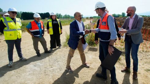Quiroga, junto al alcalde de Camponaraya, Eduardo Morán, y la alcaldesa de Cacabelos, Irene González, han visitado este miércoles las obras de emergencia del sistema de saneamiento del Bierzo Bajo, que ejecuta el organismo de cuenca.