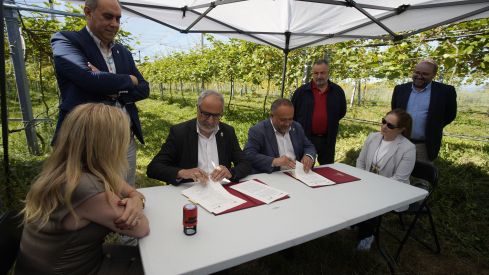 La firma del convenio se realizó en una de las fincas arrendadas a través del Consejo Comarcal, que alberga una plantación de kiwis de 2,5 hectáreas y otra de pimientos de tres hectáreas.