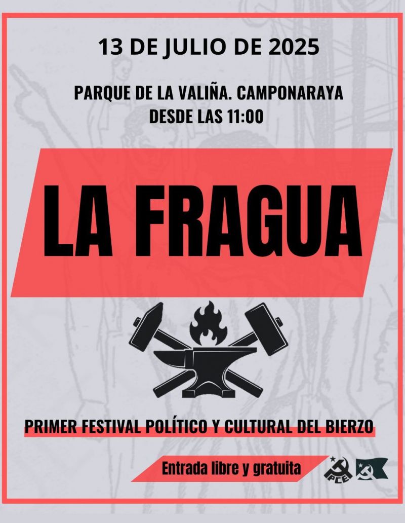 Al respecto, la organización ha hecho un llamamiento a la participación en el evento. El programa del primer Festival Político y Cultural 'La Fragua' arrancará a las 11:00 h con la presentación del libro 'La Primavera Antifranquista. Lucha obrera y democrática en El Bierzo y Laciana' a cargo del historiador Alejandro Martínez; seguirá a las 11:45 h con un coloquio sobre 'La educación pública amenazada' con Víctor Bejega (CCOO) y Carlota Álvarez (UJCE); y a las 12:30 h con un vermú musical con la actuación en directo de Los Fuérganos.