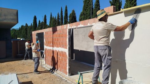 Para acabar con esa carencia, uno de los taller de albañilería se ha encargado de construir un muro de hormigón de 11 metros de largo y 90 cm de altura para el cierre de la parcela. Por la parte interior se ejecutó un zuncho de hormigón sobre el que se asentó la construcción, que ocupa 25 m². La misma se ha hecho con bloques de termoarcilla con un acabado interior a base de enfoscado y doble capa de pintura.
