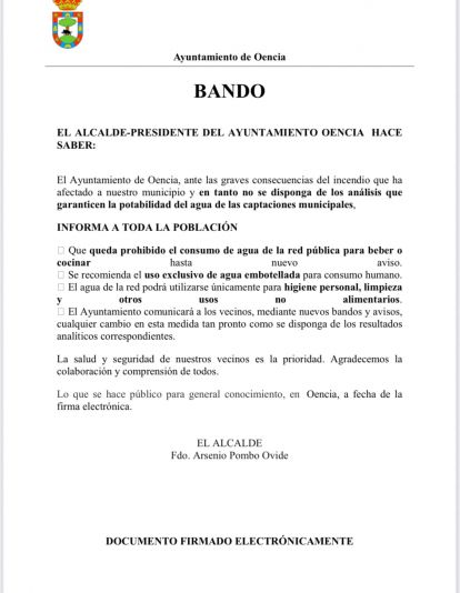 El Ayuntamiento de Oencia ha prohibido el consumo de agua de la red pública para beber o cocinar, tras el grave incendio que ha afectado al municipio.