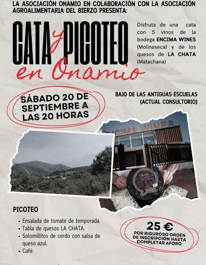 La localidad de Onamio acogerá el próximo sábado, 20 de septiembre, la actividad “Cata y Picoteo en Onamio”, organizada por la Asociación Onamio en colaboración con la Asociación Agroalimentaria del Bierzo.