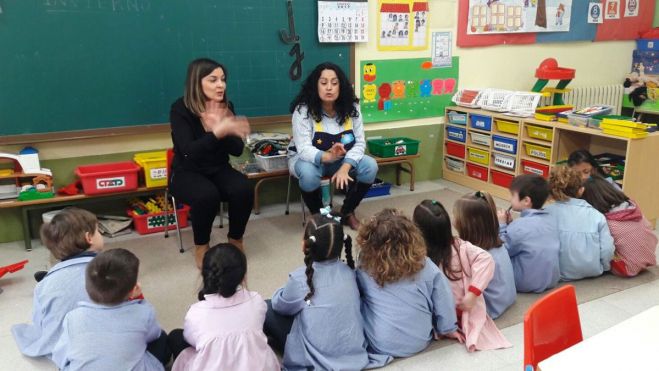 La mediadora comunicativa está presente en muchas sesiones para interpretar cuentos y canciones en lengua de signosEl método integrador de Peñalba hace que todos los alumnos del centro se vean favorecidos por las acciones que forman parte de este plan de atención a la diversidad. Por ejemplo, en las aulas en las que hay niños con hipoacusia, la mediadora comunicativa está presente en muchas sesiones de las clases para interpretar en lengua de signos cuentos, canciones, poesías o explicaciones de los maestros.La implicación y metodología que aplica en su tarea sirve paraque todos los niños del aula sean partícipes de la actividad y capten muchos de los significados, iniciándosede forma natural en el aprendizaje de la lengua de signos.