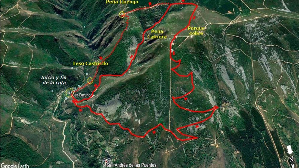 Una vez rebasamos la Peña Cabrera, el sendero se va alejando de la corriente fluvial e incrementa su pendiente hasta alcanzar las pistas cortafuegos y los amplios caminos forestales habilitados para el mantenimiento de los parques eólicos ubicados a lomos del sólido monte del Redondal. Desde aquí tenemos dos opciones para alcanzar de nuevo San Facundo. Si seguimos la opción del itinerario corto, indicada en el plano de la ruta en línea discontinua, descenderemos de nuevo al pueblo, desde el aerogenerador situado en Peña Lluenga, por la afilada cresta que separa las cuencas de los arroyos de Sofredo y Rial.
