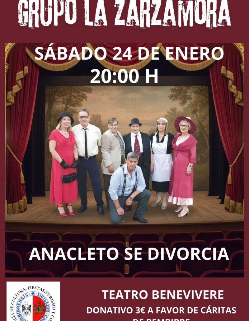 La primera de las citas tendrá lugar el sábado 24, con una función de carácter solidario cuya recaudación —3 euros por persona— irá destinada a Cáritas, reforzando así el componente social de la programación. Bajo el nombre 'Anacleto se divorcia', el Grupo La Zarzamora actuará a partir de las 20:00 horas.