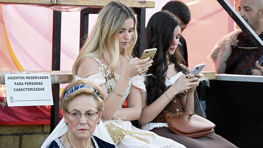 No se les puede negar la obediencia debida. Impecable comportamiento. Han visto el cartel de ‘Asientos reservados para personas caracterizadas’ y han procedido a hacer caso a las instrucciones del acto y se han caracterizado de lo que son, adolescentes (tal vez jóvenes, no quisiera ofender) vestidas para la ocasión, pero con el elemento más característico de su tiempo y edad: el móvil; ese teléfono que menos para llamar sirve para casi todo y es el mayor azote de presuntos eruditos, que hacen una cita de Cicerón y el chaval cacharrea por su teléfono y le saca los colores porque fue Demóstenes quien realmente lo había dicho.