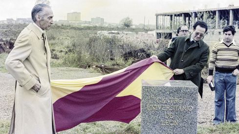 Pero en cualquier historia de la Universidad de León que se precie no se puede obviar la labor que realizó la Caja de Ahorros, presidida por entonces por Emilio Hurtado Llamas, que apostó por la compra de suelo para la Universidad de León, terrenos procedentes de los ahorros del pueblo de León, y situados en la denominada Huerta del Obispo. El 31 de diciembre de 1977 se puso la primera piedra y se erigió un monolito en lo que sería el campus de León. «En mi fotografía de hace 48 años, podéis ver a Emilio Hurtado, acompañado del Gobernador Civil, Julio Camuñas y otras autoridades, en el campus de Vegazana, inaugurando el cubo de granito con la leyenda ‘Centro Universitario de León’.