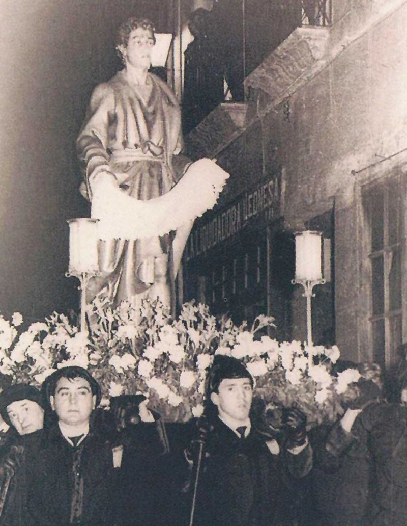 Ambos escultores estuvieron, pues, presentes en aquel doble estreno en que Francisco Fernández Díez Devesa y Ángel Suárez Ema fueron los seises encargados del Santo Sepulcro, que desfilaría a ruedas hasta 1975, y del San Juan, respectivamente, en un momento histórico para el patrimonio de Minerva.