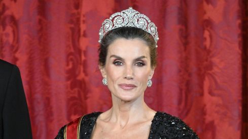 Para esta cena de gala, la Reina Letizia ha vuelto a lucir tiara, una que tenía guardada desde 2018, de Cartier, diseñada con diamantes sobre una base de platino y siete perlas que sustituyen las esmeraldas originales.