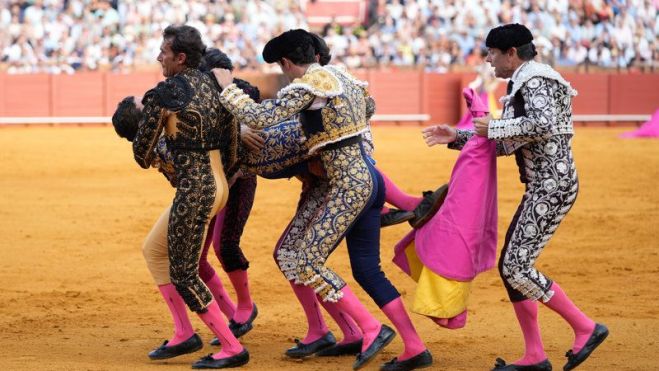 La plaza al completo se quedaba sin respiración y se llevaba las manos a la cabeza al ver a Morante siendo arrollado y corneado por el toro en la zona del glúteo izquierdo. Después de segundos de tensión en los que el maestro intentó taponarse la herida con la mano tendido boca abajo en el albero, era trasladado por su cuadrilla a la enfermería de La Maestranza para ser operado de urgencia debido a la gravedad de la cornada.