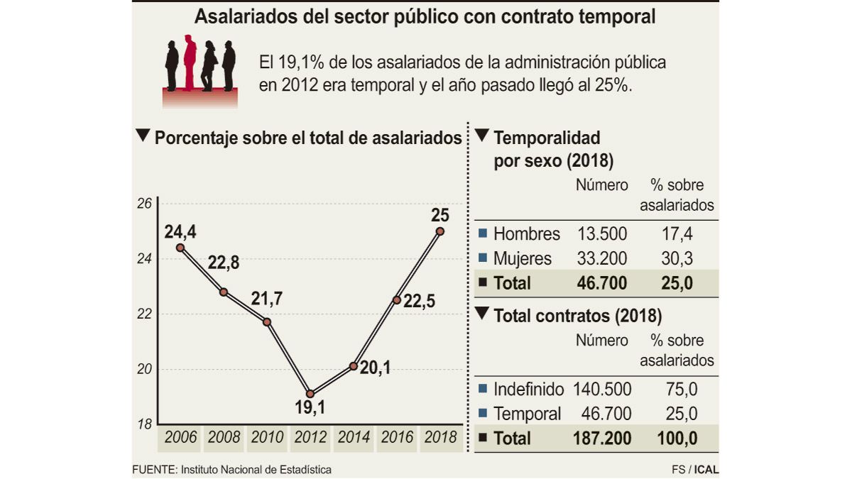 El 25 por ciento de temporalidad en las administraciones en Castilla y León, se aproxima al 25,4 por ciento de asalariados eventuales contabilizados en el sector privado, un porcentaje que se superó en varios ejercicios anteriores, 2006 (31,2 por ciento); 2007 (29 por ciento); 2008 (26,8 por ciento); 2016 (26,1 por ciento) y 2018 (25,3 por ciento).