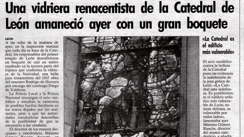 Pero también por estas fechas de abril, concretamente el 22, el templo leonés sufrió un atentado que no hacía temer por su ‘integridad’ pero había causado un daño irreparable a su gran valor, las vidrieras. Cuando a las ocho de la mañana llevaban a cabo lo que parece que era un ritual, observar la normalidad en el templo después de cada noche, descubrieron un boquete de casi un metro cuadrado en la tercera parte «del tríptico que conforma la vidriera de la Natividad, una jora trenacentista de 1565, obra del maestro Rodrigo de Herrera, por encargo del canónigo Diego de Valderas. Gómez Rascón, el gran experto en Patrimonio de la iglesia no dudaba en afirmar que se trataba de «la mayor agresión que ha sufrido la primera joya del arte de León».