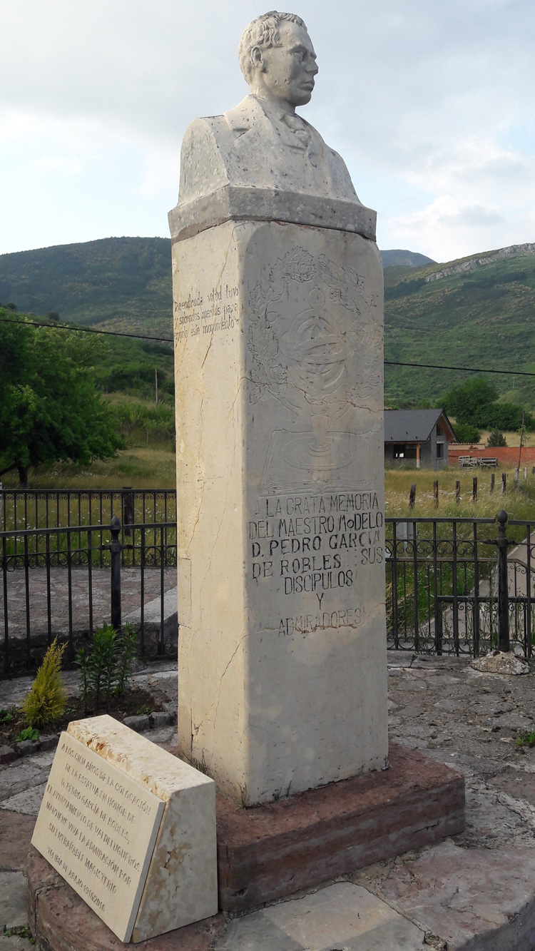 Sentado al pie del busto alzado enfrente de la escuela, en 1916, a la grata memoria de don Pedro García de Robles, maestro que fue durante cuarenta y cinco años de este Concejo de Valdelugueros. Un busto que, según al Tío Ezequiel le dijo un día el inspector de la zona del Magisterio, es el único monumento erigido en todo el mundo a la humilde memoria de un maestro». Es un pasaje del libro de Julio Llamazares en el que cuenta su paso por Tolibia de Abajo, el pueblo de la casa de los duendes... y el monumento a don Pedro. Es cierto que presumen en el pueblo, y aún lo siguen haciendo, de ser el único del mundo, según les dijo el inspector. Al menos lo era en aquel lejano 1916 que se levantó pero es curioso, argumentan los actuales vecinos,que en estos tiempos de Internet que vuelan las noticias sin fronteras «nadie se haya dirigido a nosotros para desmentirlo y decirnos dónde hay otro».
