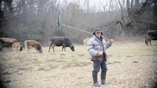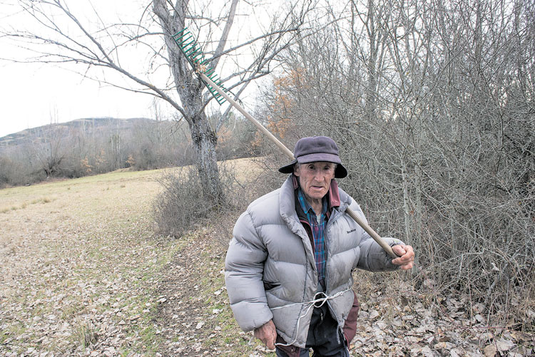 Antonio no nos espera en la cocina, con la espalda cerca de la cocina prendida para que no le falte calor, al segundo resistente hay que ir a buscarlo al monte o las praderas cercanas. «Está a lo suyo», dice Manuel. Y ‘lo suyo’ es estar con las vacas de su hijo.- ¿No podéis quitarle de ir?- Díselo tu.Pues venga. Lo encontramos en medio de una pradera rodeado de arboleda, recogiendo hojas para que «respire el suelo», rodeado de las vacas.- ¿No tiene edad para dejar de andar ya con las vacas?Para mí salir todos los días al campo con el ganado es como el aire que respiro; quitar unas hojas con el rastro, ir a aquedar las vacas, mirar como está el campo... La mirada, de arriba abajo, lo dice todo. No haría falta que añadiera más pero el paisano también es buen conversador, se apoya en el rastro con el que recogía hojas y nos explica. «Edad sí tengo para dejarlo, y me sobra, que ya tengo 90 años pero ¿me dices tú que hago yo si no vengo con las vacas, como hice toda la vida?».- Pues ver la televisión como tú cuñado Manuel.- ¿La televisión? Estás tú bueno.Si el director general de RTVE o cualquier otra cadena ve el gesto y el tono con el que Antonio dijo eso de «¿la televisión?» igual dimiten y se van al monte a cuidar ganado. Después de un breve silencio el paisano completa la reflexión.- Te digo yo lo que hago si no puedo venir con las vacas: morirme.Cambiamos de tercio. Lo de las vacas parece que está muy claro, pero además de cuidar el ganado lleva un rastro y quita las hojas que han hecho una gruesa capa sobre la hierba. - ¿Son malas las hojas caídas para el campo?- Pues, como todo, tiene su cosa. No son malas, son abono, pero así tan cerradas sobre la hierba no la dejan respirar y la matan.
