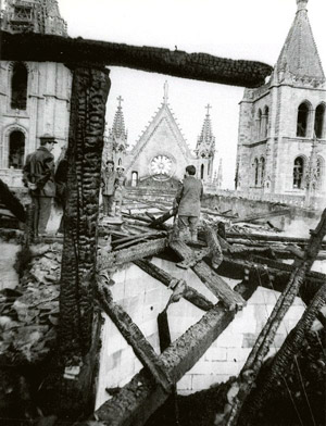 Cuando la gente salía de la catedral, a las ocho y cuarto aproximadamente, ya pudimos contemplar las llamas incipientes sobre la techumbre meridional del templo, frente al palacio episcopal.