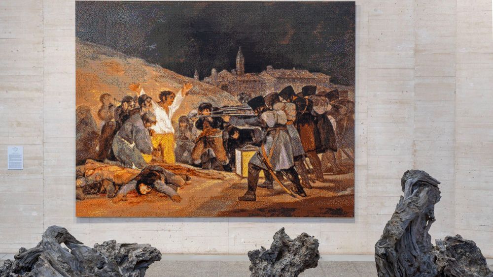 Entre las cuarenta y dos piezas que Ai Weiwei muestra hasta el próximo dieciocho de mayo en el Musac de León y que recorren veinte años de su trabajo, destacan unas nuevas producciones en las que representa significativas obras de la historia del arte occidental replicadas con ladrillos de juguete a escala real. Una de las piezas reproduce la pintura de los fusilamientos del tres de mayo y, entre los personajes del cuadro de Goya, ha colocado el autor una figura que tiene su propio rostro. En otra, usa la fotografía que conmovió al mundo entero del pequeño Aylan, muerto en la playa turca de Bodrum huyendo de las masacres en Siria, sustituyendo al niño por su propia figura, controvertida imagen que fue entendida como irrespetuosa por una parte del público.