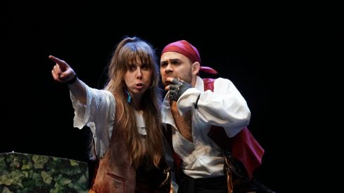 «Un teatro. Una isla desierta. Un barco pirata. Un tesoro. Un capitán vanidoso y egocéntrico. Una tripulación ilusa. Amor, codicia, venganza, y una fuerte tempestad. ¿Qué puede salir mal?», describe la sinopsis de la obra ‘Corsarios’, de una media hora de duración, que interpretan los actores Jon Casamayor, Nahikari Rodríguez y Unai Elizalde bajo la dirección de Unai García Amaro.