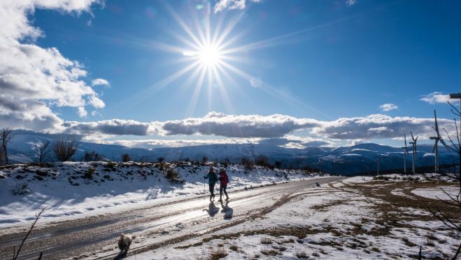 A partir del Cerro de la Escrita la amplia pista para atender a los aerogeneradores desciende y la visión del pinar al lado izquierdo se hace más sombría por el contraste de los troncos con la nieve. A la derecha restos de matorral, esqueletos de escobas, aunque ese matorral fue convertido en cenizas en mayor cantidad. La pista se encajona en momentos de bajada algo más acusada y al Nordeste, entre los aerogeneradores se ven las tierras de la Maragatería, en especial Astorga como lugar con mayor número de edificios.