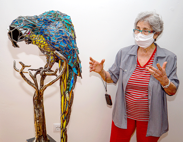 María Antonia de Lora hace escultura de dos tipos: por un lado hace obras en vidrio con un colorido que se potencia con el efecto de la luz y va variando de acuerdo con la iluminación natural, porque no es partidaria de añadir fuentes de luz artificiales a sus obras. Tiene piezas planas en las que simplemente se puede ver el colorido y la forma al trasluz y otras con un cierto volumen muy especial. Se trata en su mayor parte de representaciones de animales que han venido a la autora en el momento de su elaboración y representan los animales del jardín del Edén. Por otro lado, hay dos piezas que representan a un peregrino del camino de Santiago y el rostro del gran escritor Saramago y no tienen apenas vidrio. La autora dice: «son esculturas que requieren un gran trabajo y mucho amor. Son piezas únicas, no es una obra que haces un molde y la repites, es un trabajo en el que no cuenta el tiempo, sino el mostrar lo que quieres decir al mundo. La belleza del vidrio me he inspirado estas obras. No es algo que haya visto y copie, sino que sale de mi interior». También dice que su gran satisfacción es ver que la gente se encuentra satisfecha con su obra.Otros escultores son Cosme Paredes, que presenta varios animales creados en su peculiar estilo de chapas soldadas, que muestra su forma de ver la realidad también a través de figuras de animales, en una mezcla de su mundo de procedencia y el leonés donde actualmente trabaja.