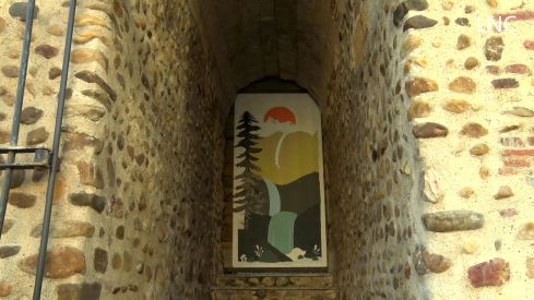 El hueco de la muralla del Archivo Histórico Provincial que da a la plaza del Espolón ha sido objeto de una nueva intervención artística por parte de dos alumnas de Cuarto de la ESO del Colegio Maristas San José, Sara Martínez Garea y Daniela Lobato Rodríguez, que se han visto arropadas en la presentación de ‘Mi refugio’ por un grupo de alumnos de Primero de la ESO de la clase de Plástica impartida por el artista y docente Carlos Álvarez Cuenllas, que también acudió a la cita junto con el delegado territorial de la Junta, Eduardo Diego, la jefa del Servicio Territorial de Cultura, Amelia Biain, y la directora del Archivo Histórico Provincial, Eva Merino.