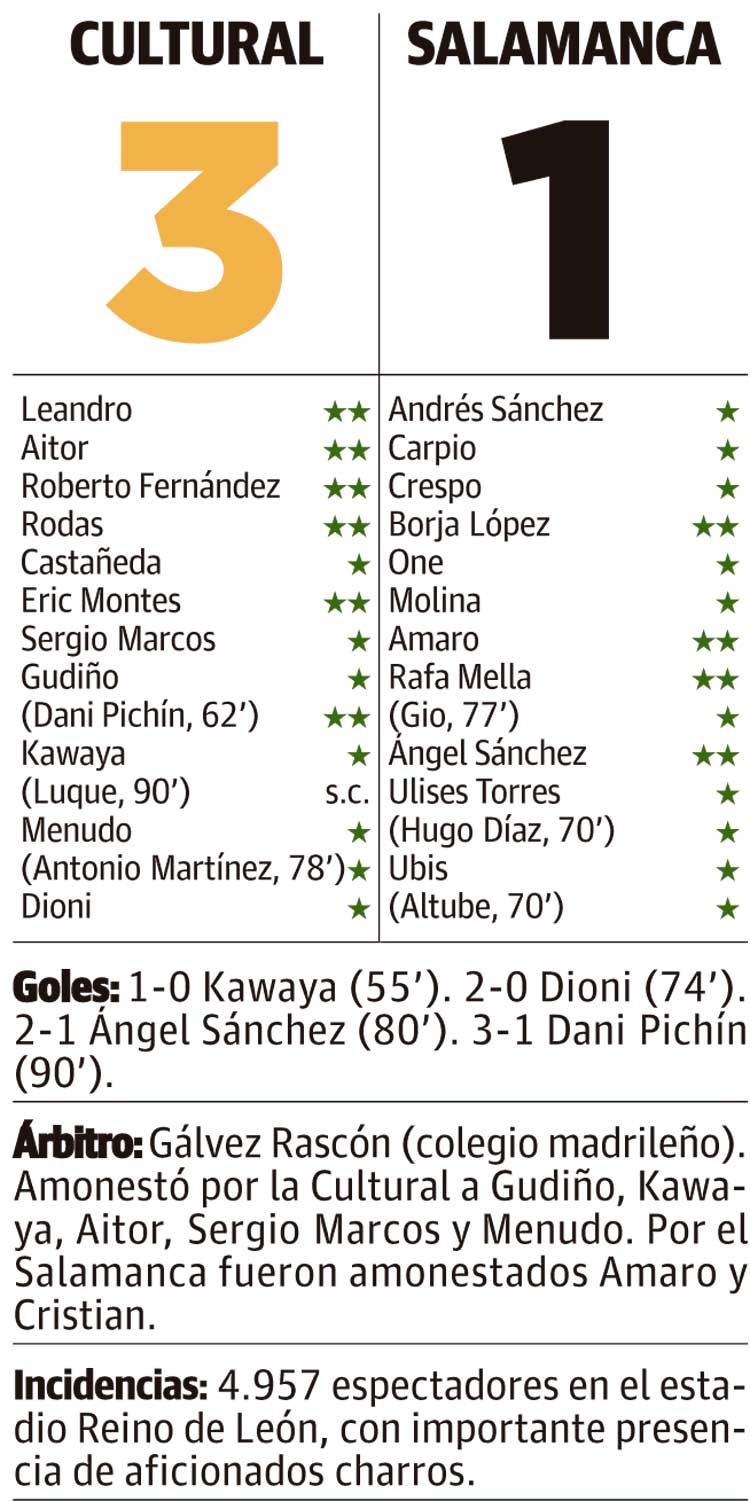 Hay veces que el fútbol no entiende de razones ni de motivos. Porque este viernes la Cultural mostró la que seguramente fue su imagen más gris en el Reino de León, hizo menos méritos de los que acumuló en sus derrotas previas... pero se reencontró con la victoria, volvió a presumir de pegada e incluso pudo recuperar la segunda plaza y recortar puntos con el liderato.El mundo al revés para un equipo leonés que logró un resultado final mucho más abultado de lo que se vio durante el partido. De hecho sufrió el conjunto de José Manuel Aira hasta el final, cuando fue capaz de sentenciar el encuentro a la carrera aprovechando unos espacios que no permitió antes un Salamanca muy serio y difícil de superar.