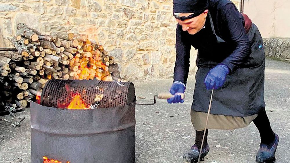 No duda ‘la panadera’ —siempre lo será por más años que pasen— en calzarse las madreñas, ponerse al pañuelo negro y sentir en su cara el calor del fuego, tan parecido al que despedía el horno en sus años en activo. Sigue siendo la misma de entonces, la que siempre estaba dispuesta a colaborar en lo que hiciera falta, la que ponía el horno a disposición de los mozos o de los no tanto.