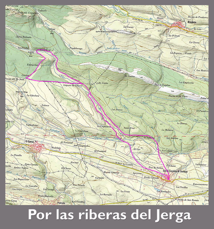 El camino desciende y sigue río arriba saliendo a una pista que baja del pinar y después continuando por la izquierda. Tras otro tramo en la ribera derecha se va a la izquierda, cruzando el río y se vuelve subiendo una cuesta que sigue en dirección sureste para girar más tarde entre los pinares durante un buen tramo que se aleja del cauce. Al final se llega al Carrizo, donde existe una excelente vista al Teleno. y en el cruce se toma el camino de la izquierda que vuelve hacia el Jerga, mientras que el camino de frente va hacia el Ganso.