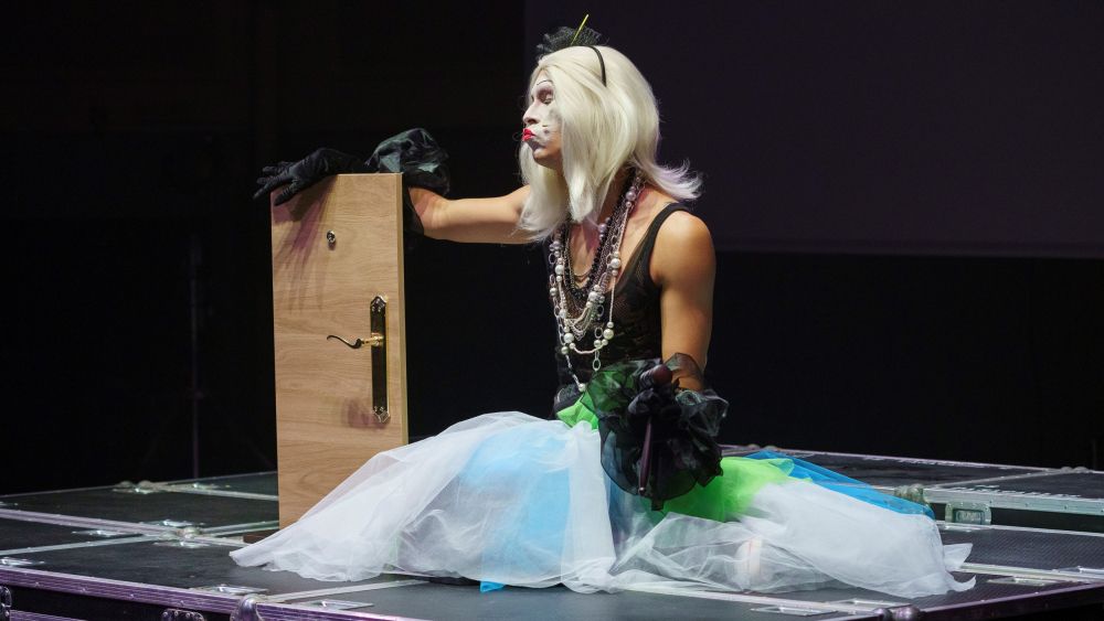 La perfomance ‘Dusted’ está ambientada en una casa de subastas. Toma como punto de partida la interferencia entre la propiedad privada y el deseo para poner en escena un «drag de la desposesión». De esta manera, la pieza recurre a la deformación semántica característica del teatro de lo ridículo, así como a la impersonalidad de la dramaturgia de los objetos para renunciar a los significados que indexan positividad y valor en los procesos de identificación. Durante este «drag show» la protagonista, en un momento de pérdida inminente, se dispondrá a subastar sus posesiones más amadas movilizando la aterradora negatividad del deseo.