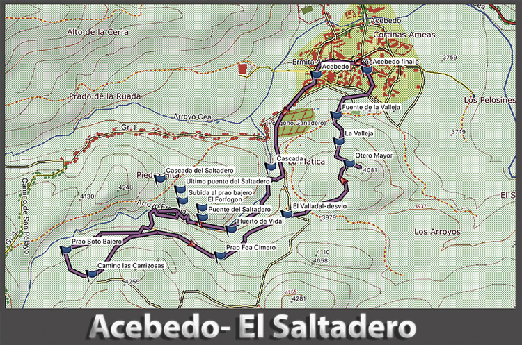 El inicio de la ruta se encuentra situado en la plaza de Acebedo, en la parte posterior de la ermita de la Virgen de la Puente, donde se ha colocado el cartel indicativo de la misma, muy bien especificado si se desea seguir tal y como ha sido diseñado y realizado por los miembros de la Junta Vecinal y la Casa del Parque de Valdeburón.Tras caminar por la calle, en dirección suroeste, dejando la ermita a la derecha, se sigue para salir de la localidad por la pista del GR 1, aunque poco después del cartel se abandona dicha pista para seguir por el camino amplio de la izquierda, hacia arriba por la zona de la Matica, para poco después, cuando se llega al prado llamado Fea Bajero, se baja al cauce del arroyo Erendia donde se encuentra una primera cascada que fue realizada para canalizar el agua que daba fuerza al generador de la antigua fábrica de la luz. A pesar de ser una construcción humana, la cascada que se forma es la una de las imágenes hermosas que se van a encontrar en la ruta.