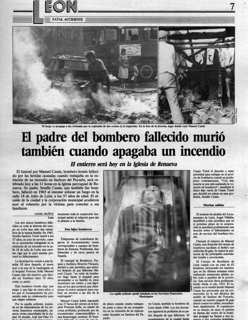 En agosto de 1987, va a hacer 40 años, la prensa daba cuenta de la muerte de Manuel Casais, de cuarenta años, casado y padre de una niña de cinco años. Pero al contar el triste suceso le recuerdan a los informadores que treinta años antes, el padre de la víctima, Serafín, bombero de 57 años, había fallecido intentando sofocar un incendio en la calle 18 de julio de la capital leonesa. Mientras trabajaba en la extinción, lanzando agua contra el fuego, una enorme viga se desprendió, golpeándole en la cabeza y el bombero leonés falleció prácticamente en el acto.