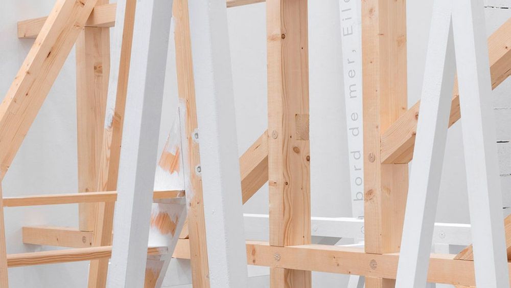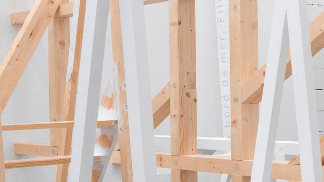 Desde el hastial de la cabecera se expanden por la sala, en distintas posiciones, un gran número de vigas blancas, similares a las que configuran los testeros transparentes de vidrio con los que la galería se abre al campo, en un montaje que provoca la sensación óptica de que el edificio se desmonta hasta tocar el suelo. Las líneas blancas que cruzan el aire de la exposición son prolongaciones del edifico que llevan inscritos nombres de autores y títulos de libros con los que la artista da contenido teórico a su acción, como si cada texto hubiera desplazado simbólicamente un soporte de la fábrica para entender toda la estructura. Se levanta así una suerte de guía bibliográfica incorporada a las piezas que quedará flotando en la mirada del espectador no iniciado de forma hermética pero sugestiva, del mismo modo que los libros integrados a la masa de piedras del talco de antiguas minas de la zona, pequeños volúmenes que recorren las paredes de lado a lado describiendo largas líneas rectas hacia los puntos de fuga en el horizonte.